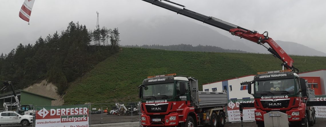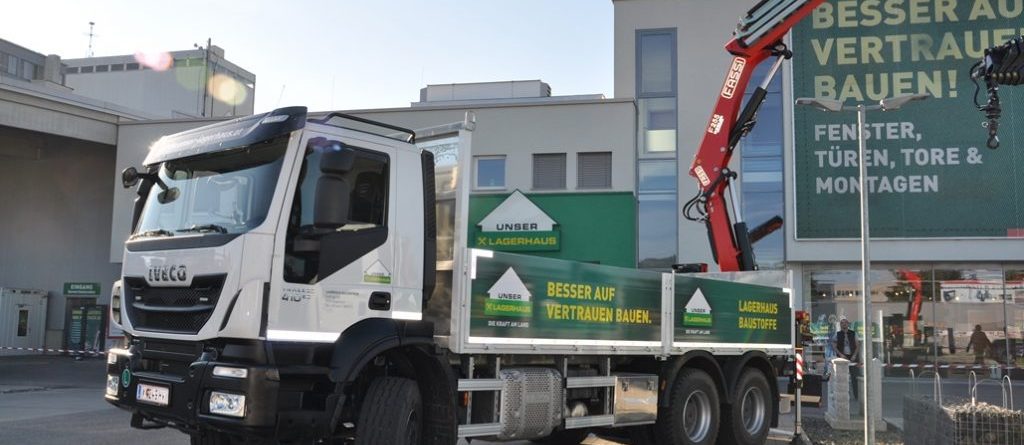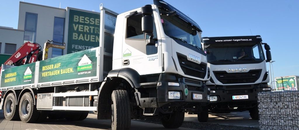 Die neuen IVECO Trakker setzen in Sachen Ergonomie, Komfort, Sicherheit und Infotainment neue Maßstäbe. Die Fahrzeuge sind ideal für den Einsatz geeignet. Auch wenn manchmal schwierige Bedingungen bei den Lieferungen auf Baustellen vorherrschen. Dank robuster Fahrgestellrahmen sowie leistungsstarker Motoren ist eine hohe Zuverlässigkeit und Einsatzbereitschaft garantiert. Aufgebaut sind die vier neuen Iveco Trakker mit einer Pritsche der Fa. Lenhardt GmbH. Die hohen Ladebordwände sorgen für eine sichere Beförderung der Ladung. Ein Fassi-Ladekran der Fa. Kogler Krantechnik bürgt zudem für eine einwandfreie Be- und Entladung.